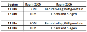 Abgerundet wird die Berufsorientierung auf der Wittgensteiner Ausbildungsmesse 2023 durch ein Veranstaltungsangebot des Berufskollegs Wittgenstein, der FOM Hochschule, der THM – StudiumPlus sowie des Finanzamts Siegen. Im 2. OG von Trakt 2 stehen hierfür die Klassenräume 2205 und 2206 zur Verfügung.